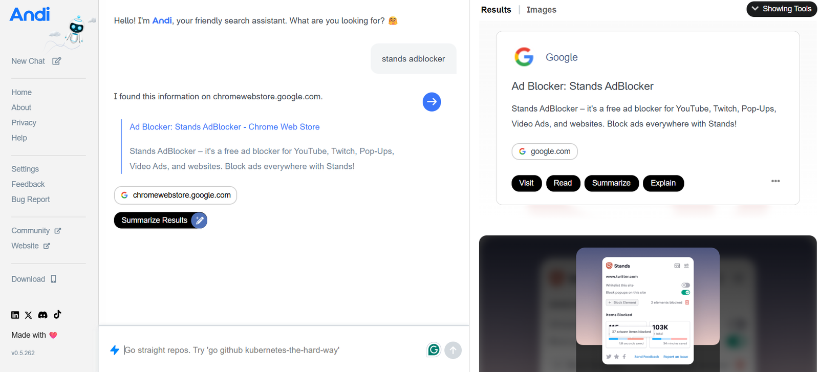 Andi is an excellent choice for those looking for a ChatGPT-like search experience integrated with web browsing.