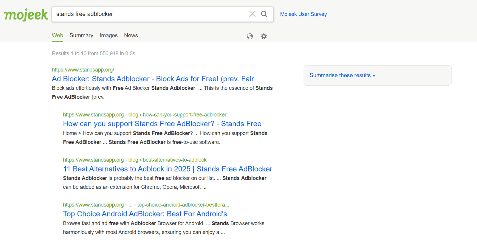 Mojeek is a search engine with no ads, independent of Google and Bing, with its own search index of over 6 billion pages.