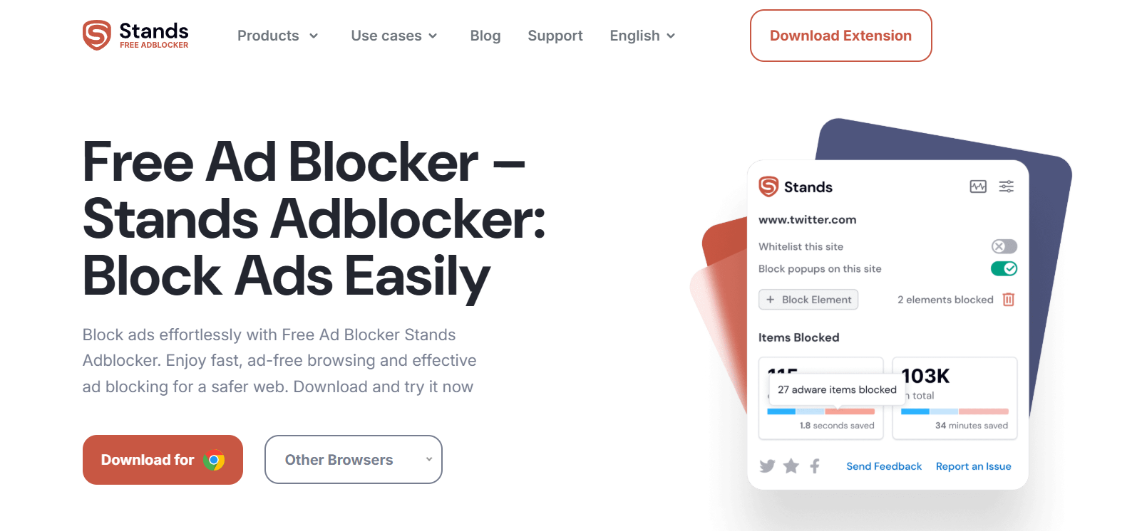 Stands Adblocker is one of the most effective ad blockers and also removes trackers and cookies, without affecting page functionality.
