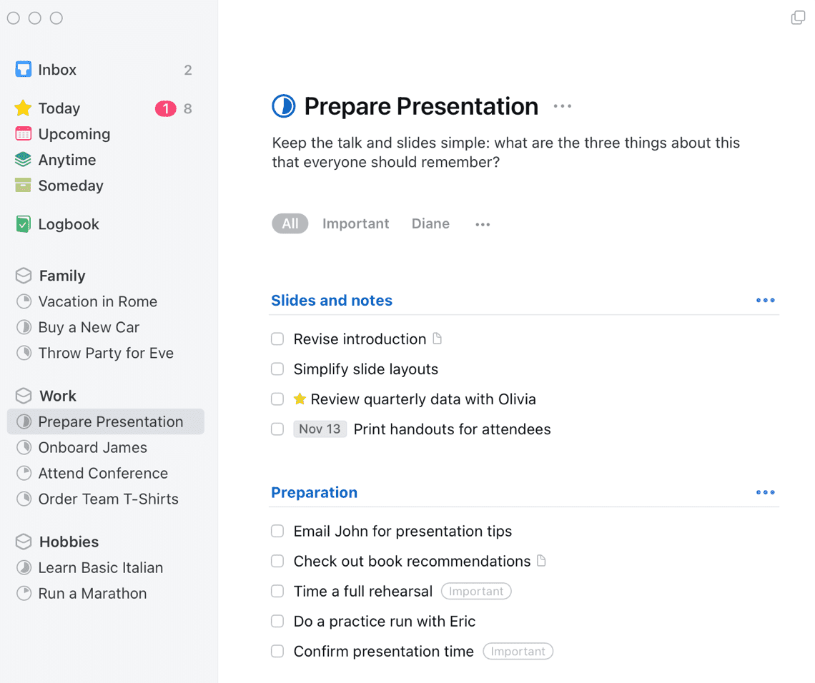 - Tasks can be grouped into sub-tasks, projects, and areas of interest, allowing users to maintain an organized and structured system.