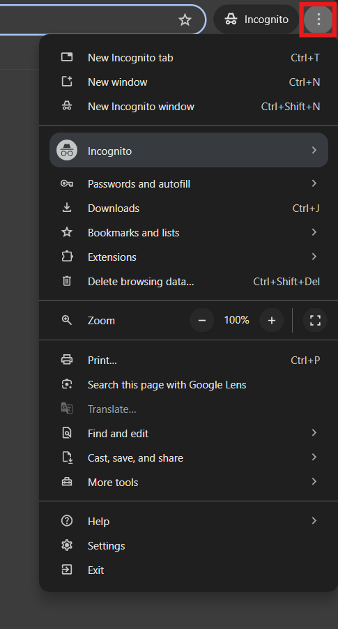 The Chrome browser menu is located in the upper-right corner of the screen. Here you can: