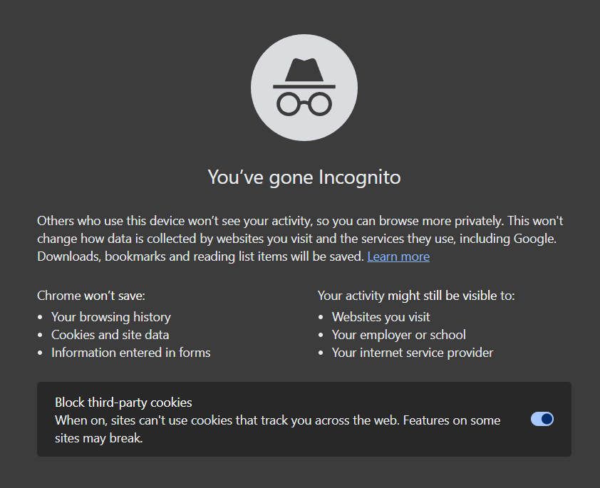 Incognito mode protects your activity locally by not saving history, cookies, or filled-in forms. However, your Internet provider, your employers, or the websites you visit can still track your activity.