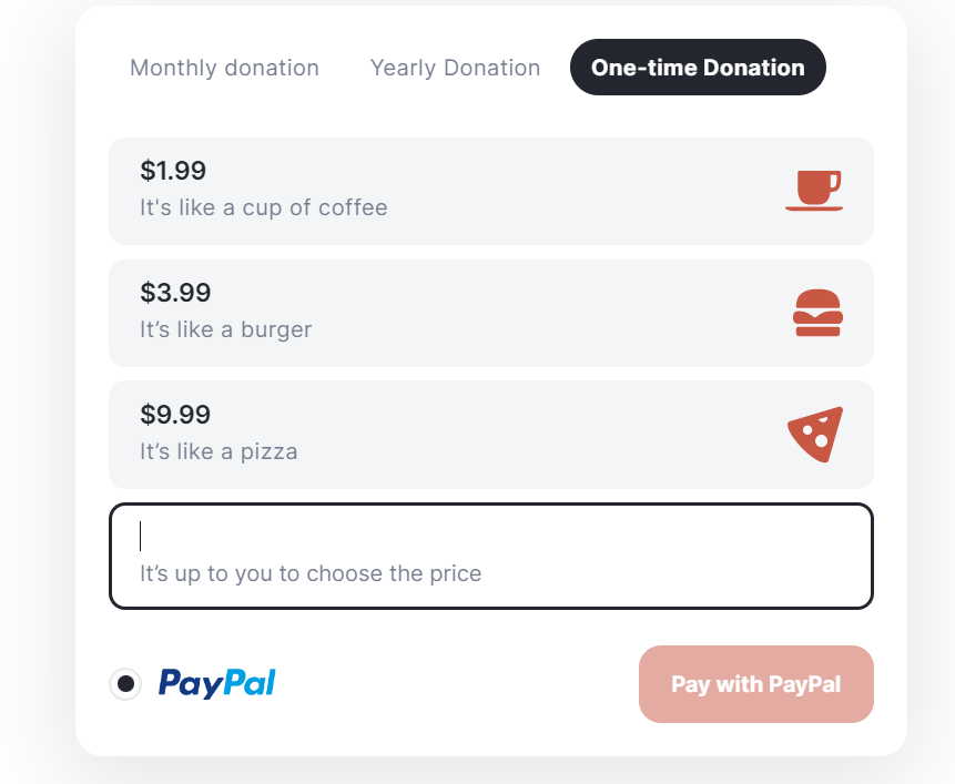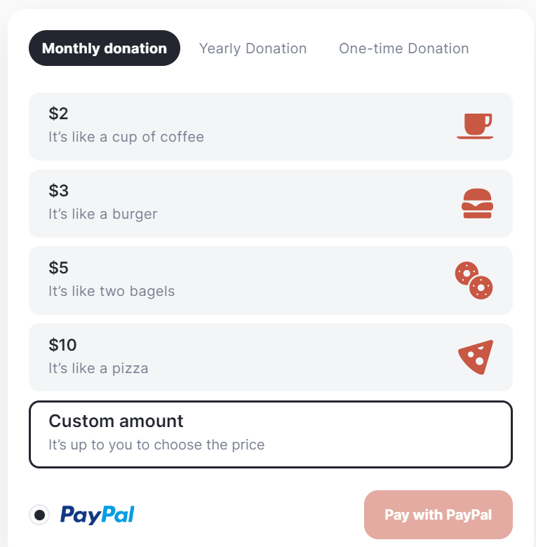 There are monthly and yearly donation options available. It is necessary to have a PayPal account to be able to unsubscribe at any time.