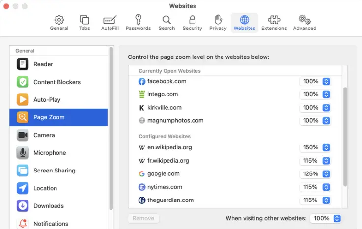 3. In the Safari preferences window, select the Websites tab to manage specific settings for different websites.