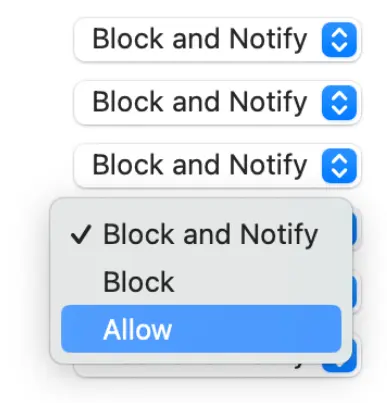 At the bottom of the pop-up section is an option to set the default behavior for all other websites. You can choose Block or Block and Notify or Allow.