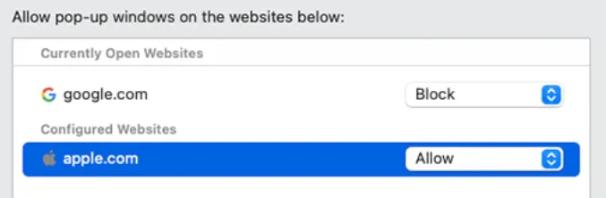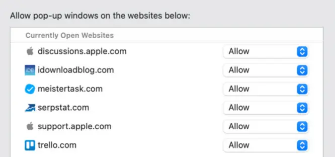 In the list of websites that appear, you can see the sites you currently have open in Safari (Current Websites). To the right of the site name is a drop-down menu where you can select Allow to allow all pop-ups on that specific site.