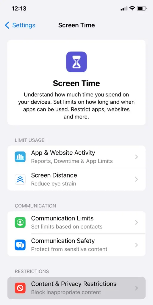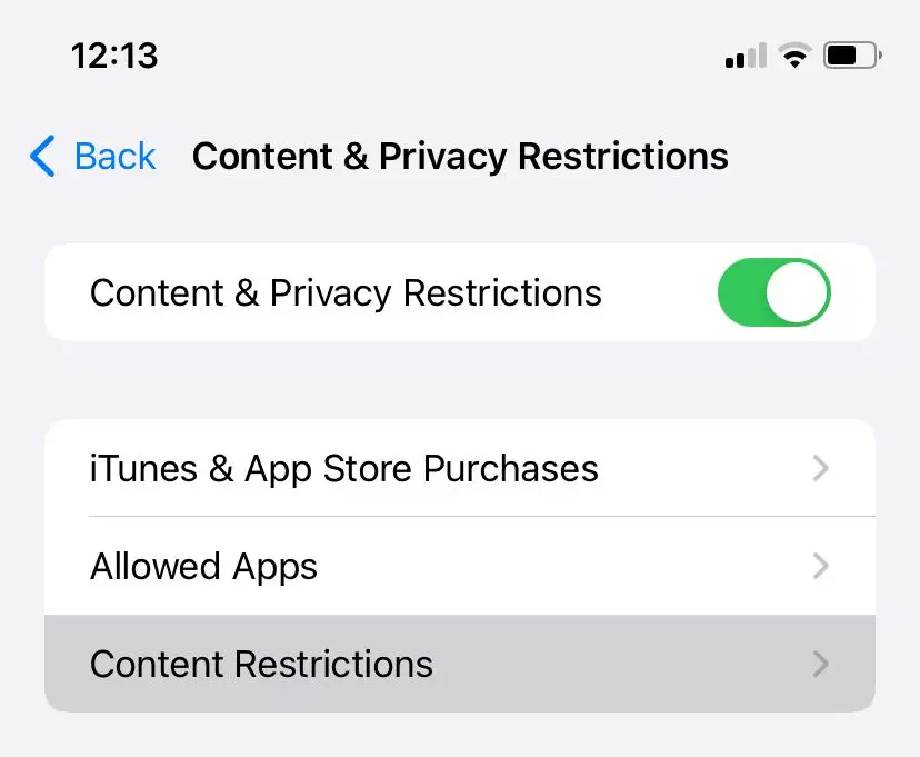 To turn on Content and Privacy Restrictions, click on it and toggle the switch to green. And then go to Content Restrictions.