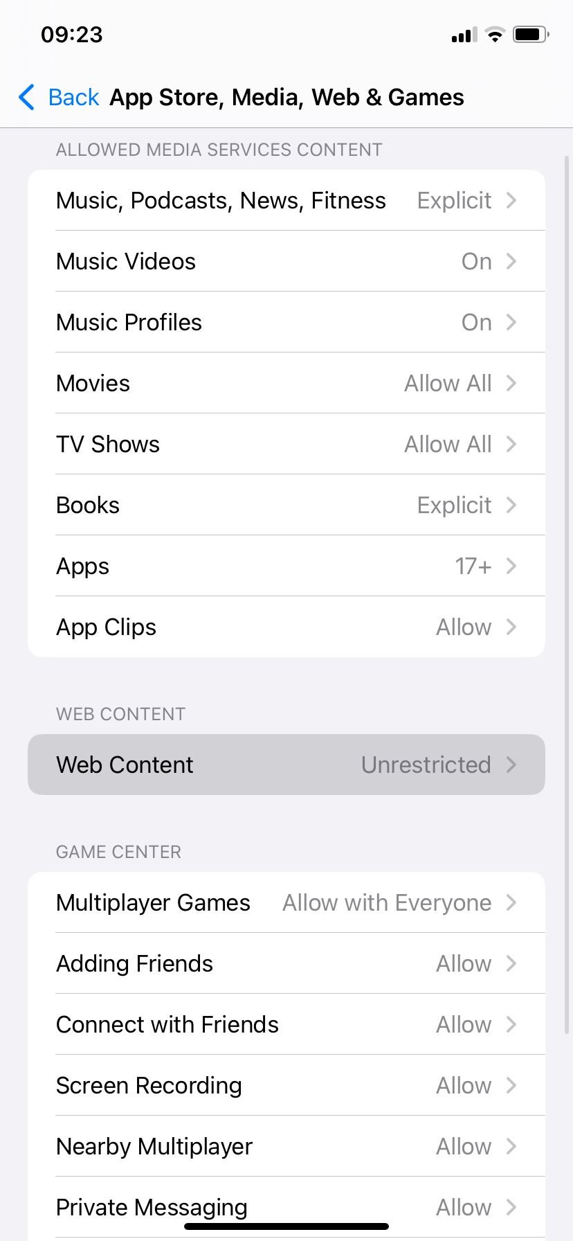 - Go to Web Content and select Limit Adult Websites.