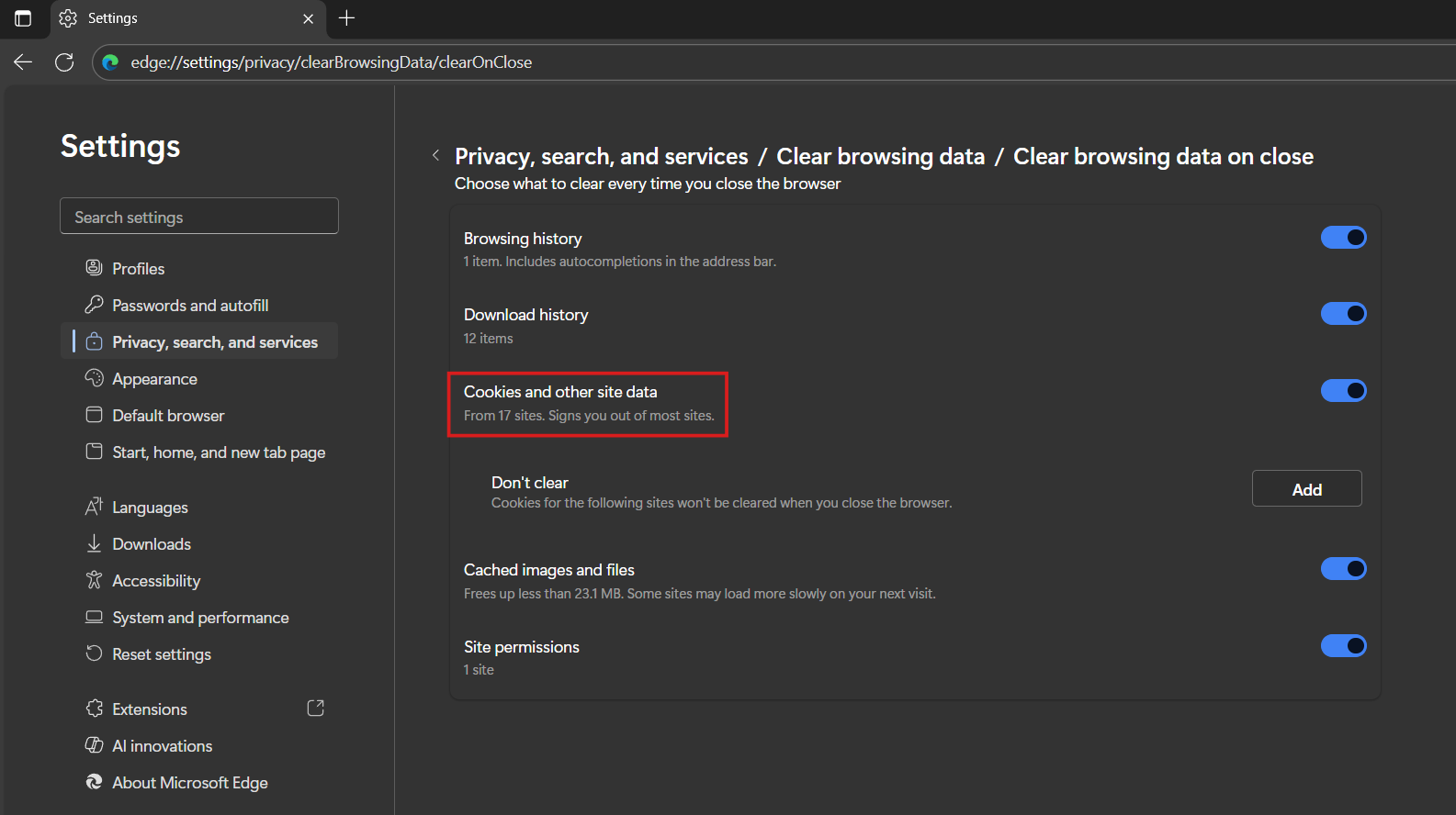 3. Toggle the option Cookies and other site data to clear cookies in Edge automatically.