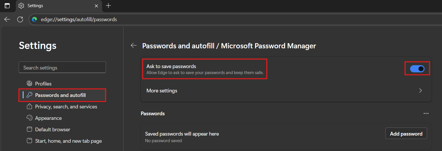 4. Enable the option Ask to save passwords (if you use a Microsoft Account).