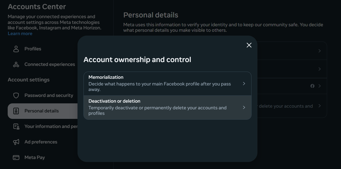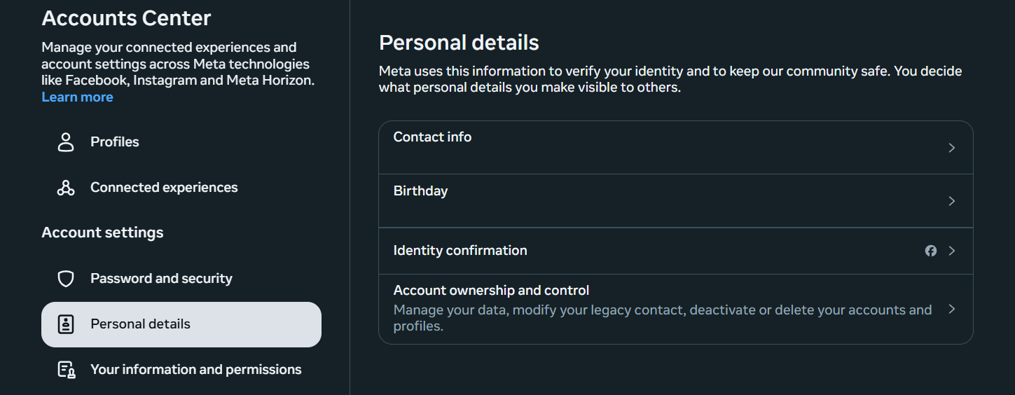 - Go to Accounts Center → Personal details → Account ownership and control.
