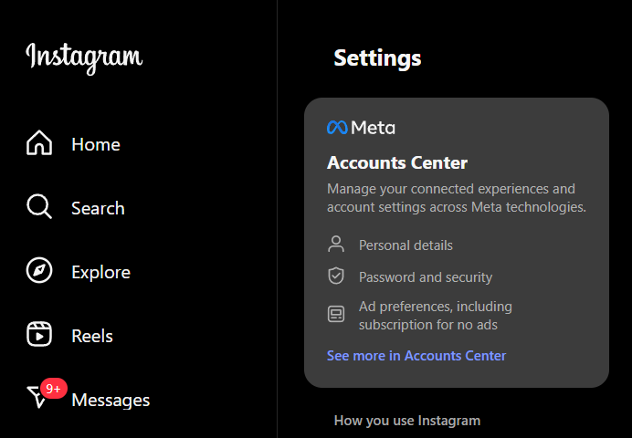 - Open your account via Settings → Account Center (from Instagram or Facebook).