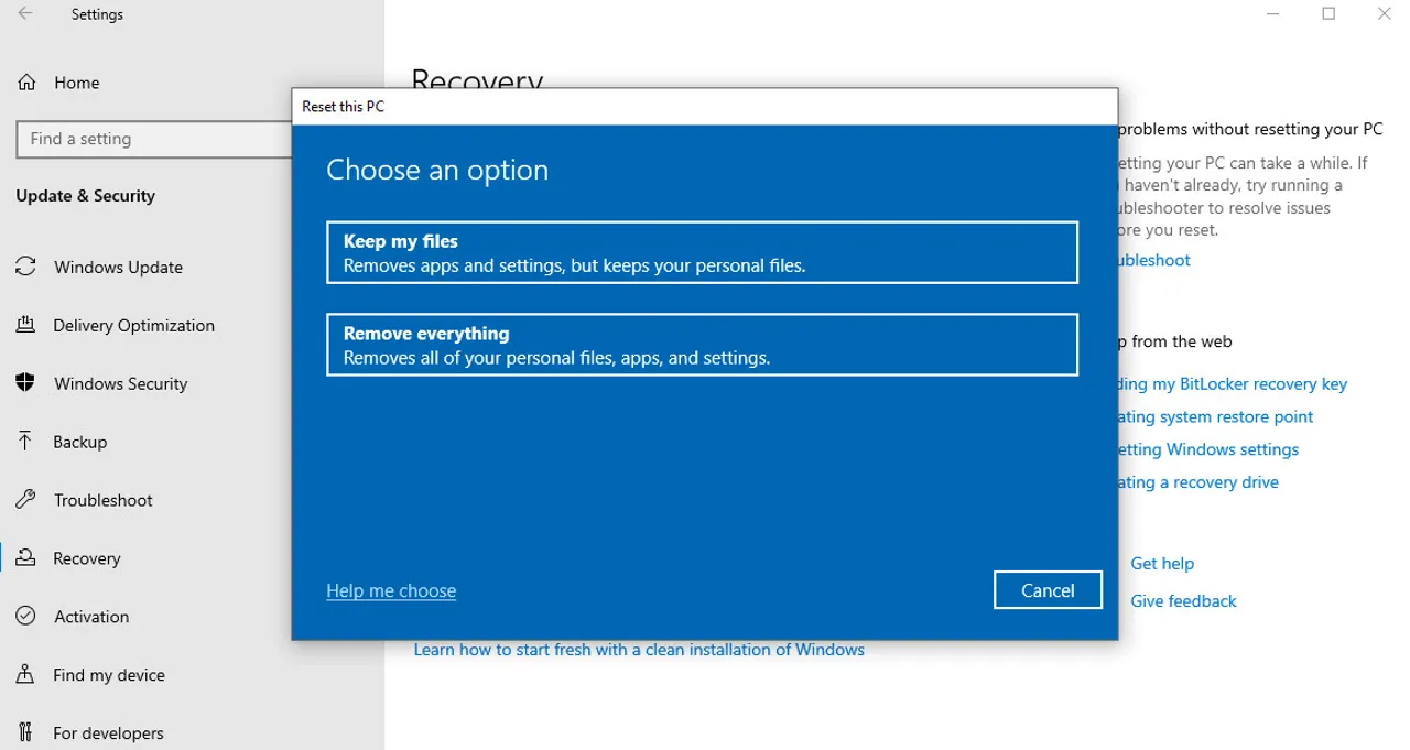 - If you select “Keep my files,” your personal documents will not be deleted.