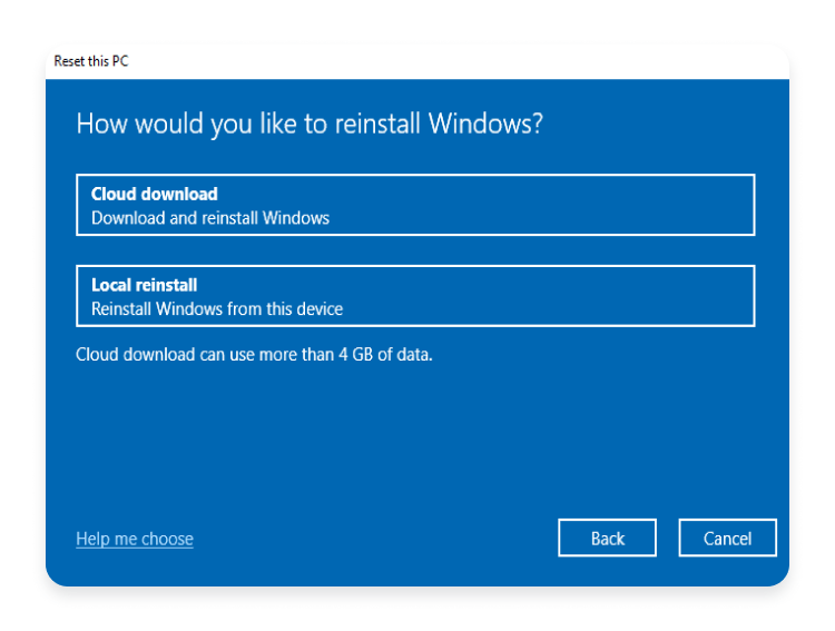 - Choose whether you want to download Windows from the cloud or perform a local reinstallation.