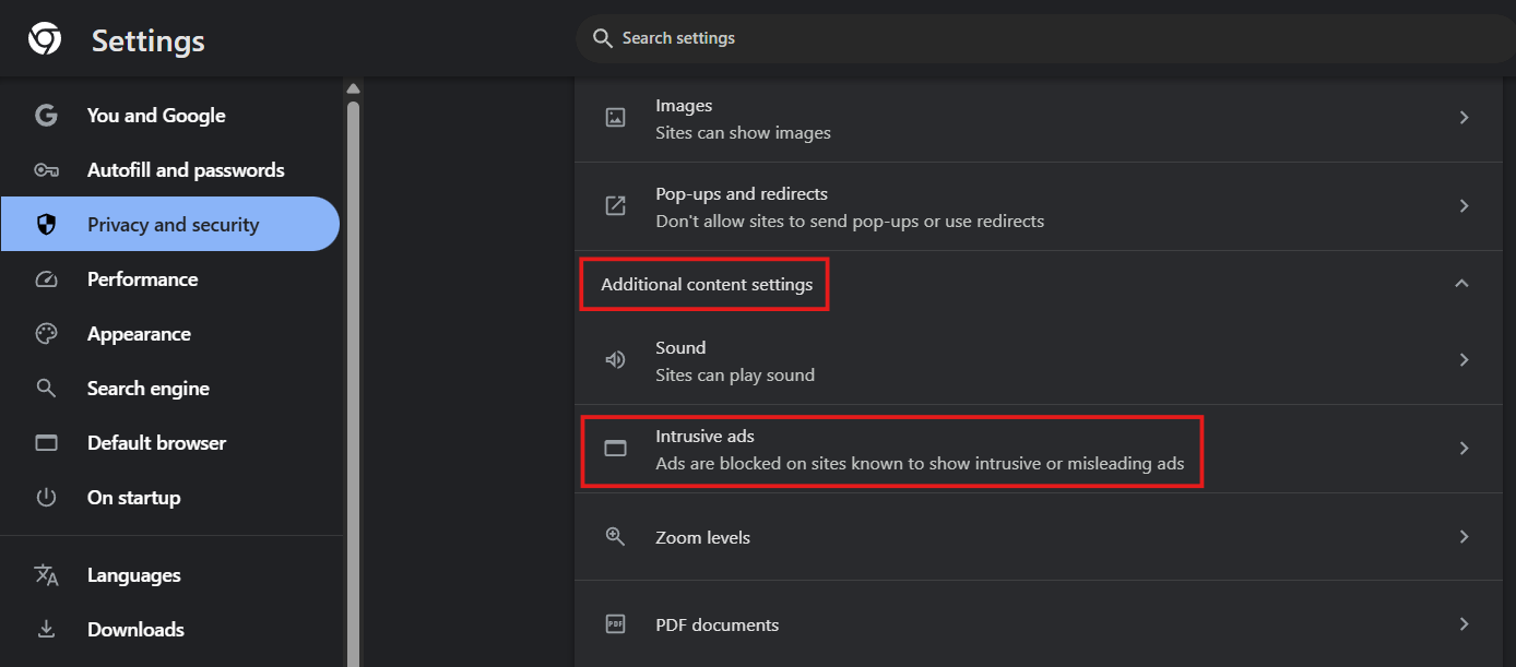 - Go to Settings → Privacy and security → Site settings → Additional content settings → Ads.