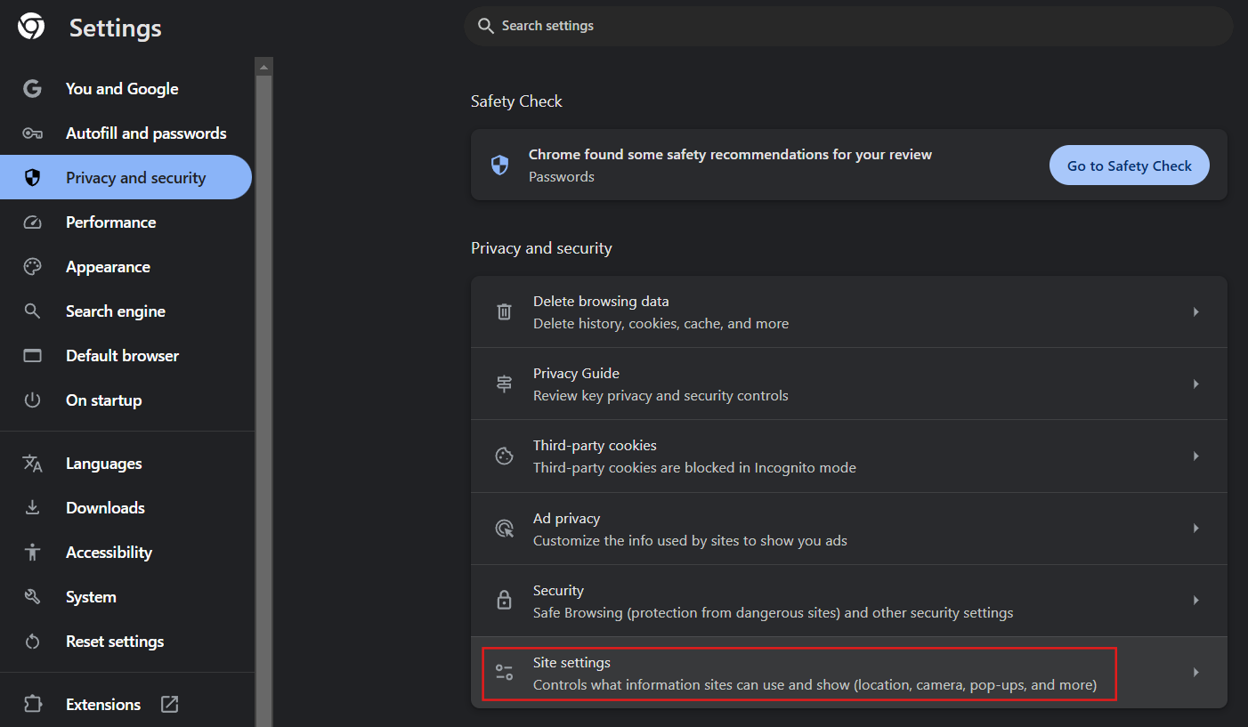 - Then go to Privacy and security → Site settings → Notifications.