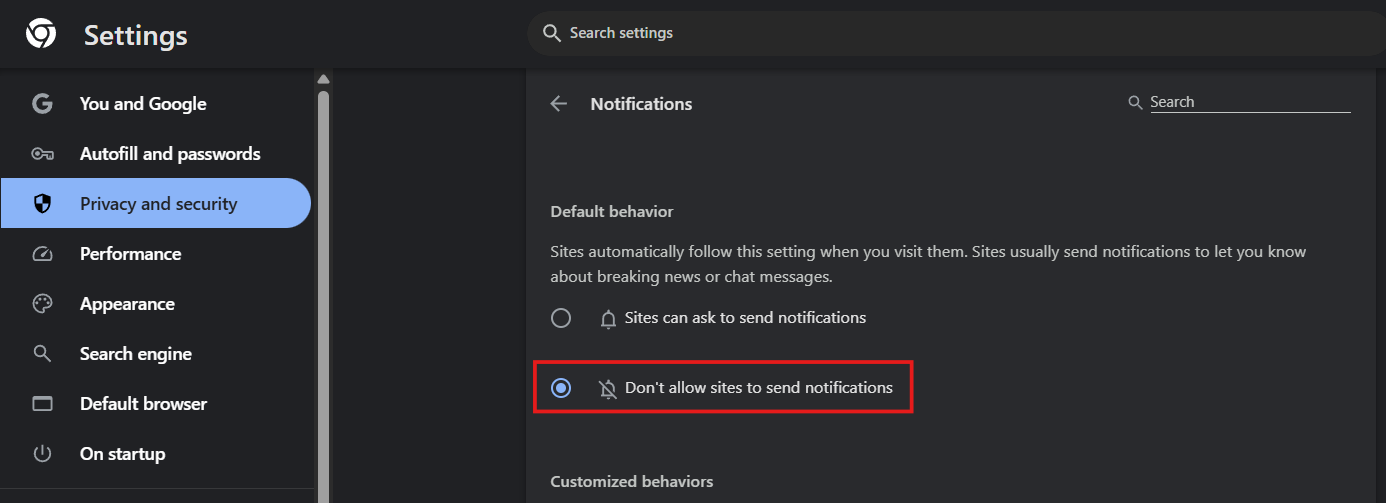 - Select the option Don't allow sites to send notifications.