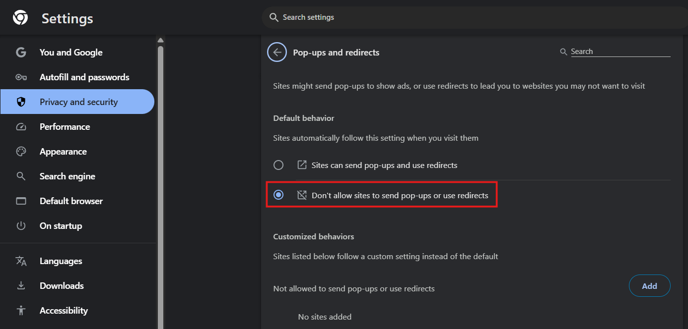- Enable the option Don't allow sites to send pop-ups or use redirects.