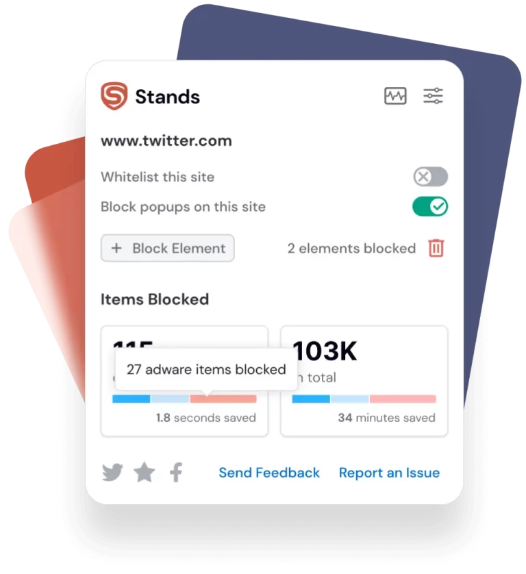 • Stands Ad blocker installs in seconds and requires no registration. From its icon, Stands removes ads, adds exceptions, and activates advanced features without complications.
