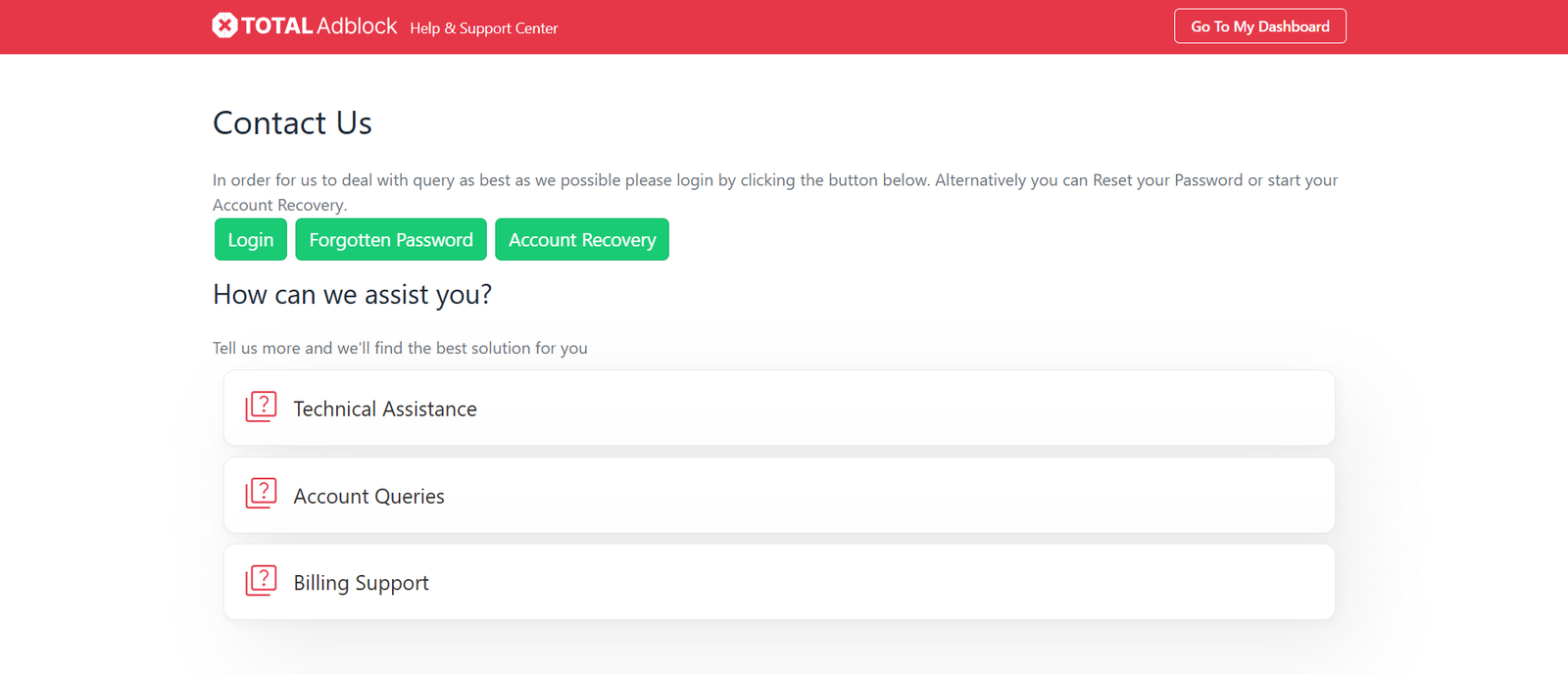 - Call Total Adblock customer service at (833) 201-8682, which is provided on their website.