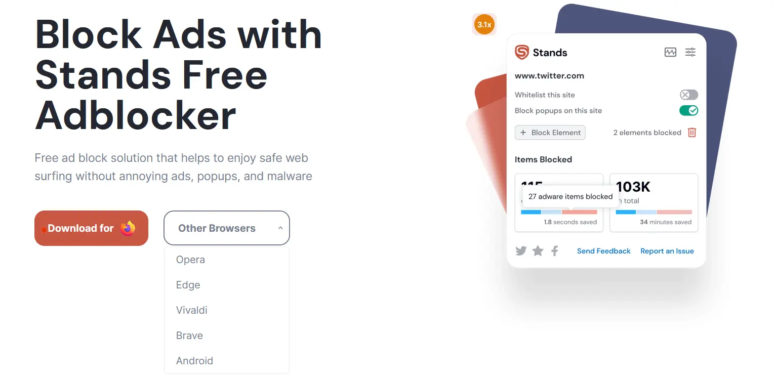 With over 1,000,000 adblock users from over 170 countries, Stands AdBlocker is 100% free ad-blocking software that will upgrade your browsing experience.