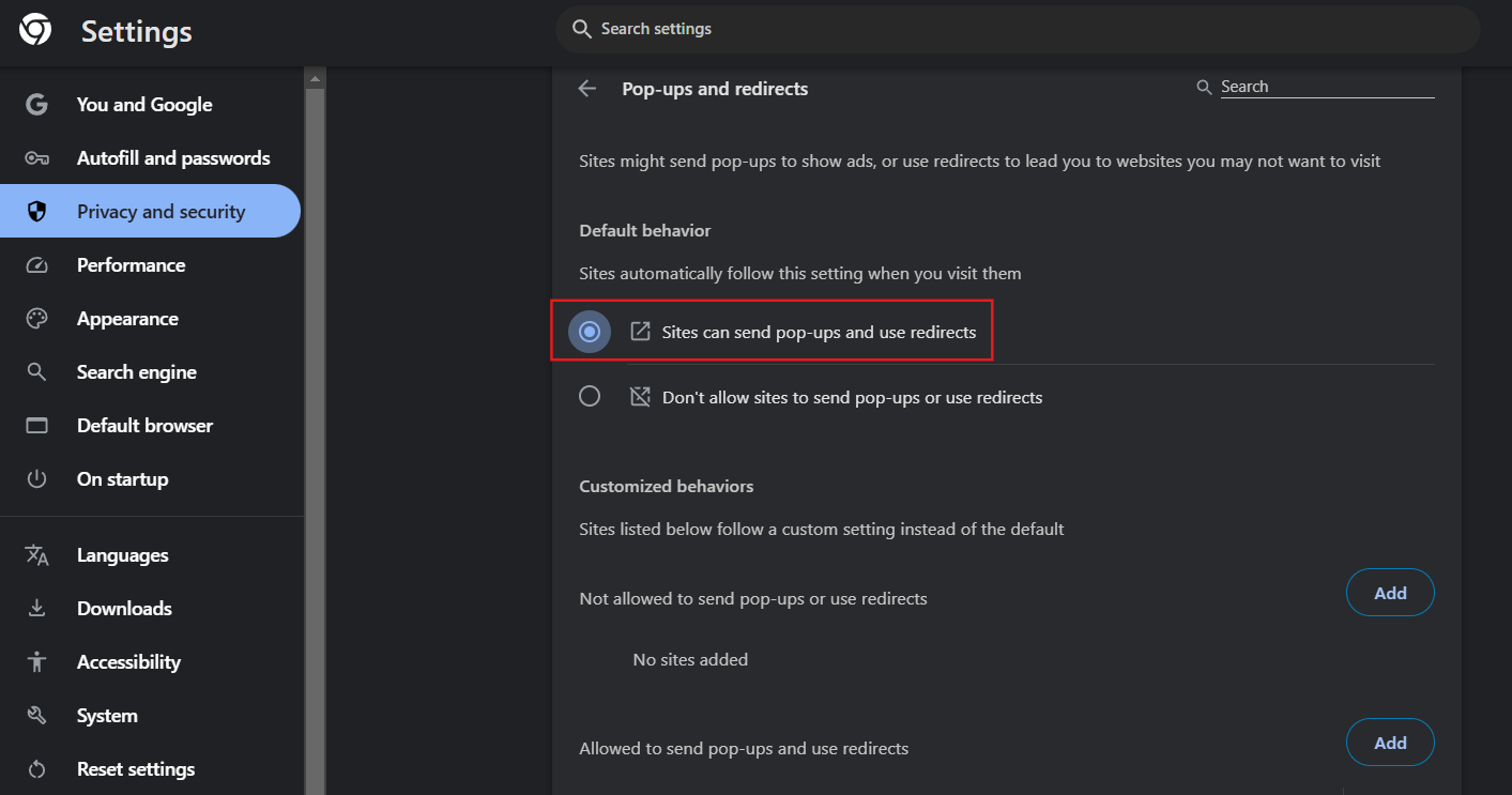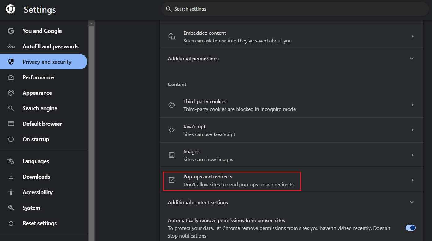 5. Busca la opción Ventanas emergentes y redirecciones.