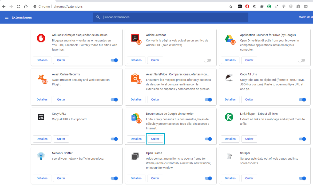 3. Encuentra la extensión que quieres quitar o deshabilitar y haz clic en Eliminar.